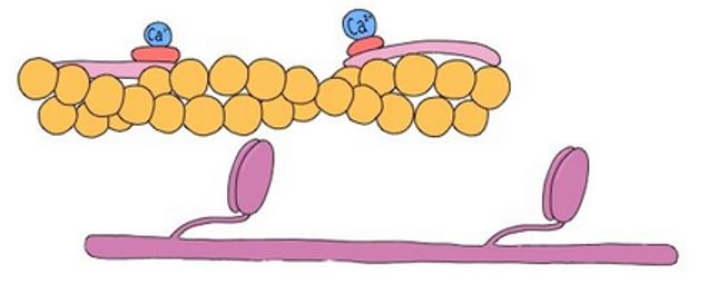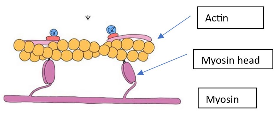 The sarcomere has a ‘thick filament’ called myosin and a ‘thin filament’ called actin, as shown below. During heart muscle contraction, the myosin heads cross-link with actin.