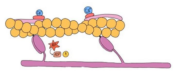 The myosin heads subsequently detach from the actin to be ready to cross-link again with actin for the next contraction.